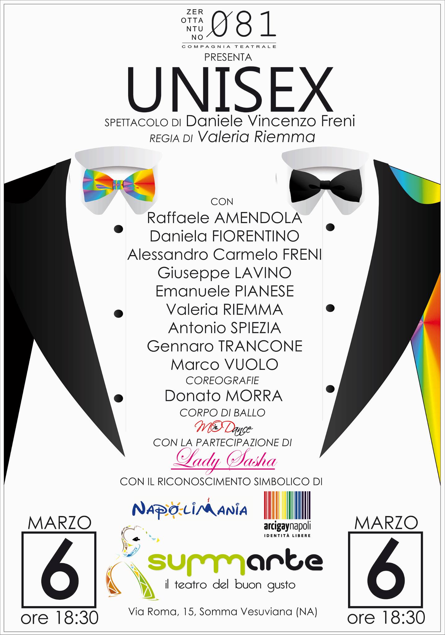 “Fabiano è un ballerino, in lotta con se stesso, che decide di fare outing. Il gesto, come per magia porterà alla comparsa di Saffo, la sua coscienza, da quel momento ogni cosa sarà diversa.” In scena al “Teatro Summarte” di Somma Vesuviana, in data unica, domenica 6 Marzo, “Unisex” è uno spettacolo inedito, per forma ed originalità. Di Daniele Vincenzo Freni , diretto da Valeria Riemma, vedrà come protagonisti in scena la compagnia teatrale “081” (Emanuele Pianese, Antonio Spiezia, Daniela Fiorentino, Marco Vuolo, Alessandro Carmelo Freni, Giuseppe Lavino, Gennaro Trancone, Valeria Riemma e Raffaele Amendola). Il testo, attraverso le vicende di Fabiano, e del suo quotidiano contesto , fatto di affetti e pregiudizi che è realtà, triste e spietata, ma anche simbolo, di altre storie, fatte di orgoglio e tanta dignità. Storie che raccontano l’amore.